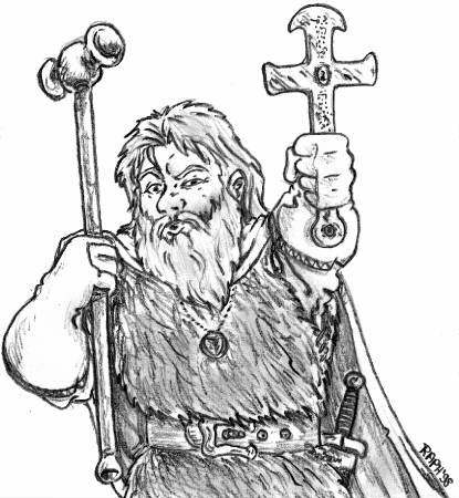 Equipement: Hide Armor (bear hides), Backpack, small copper cross (Holy Symbol), Silk Rope, Wineskin, Grappling Hook, Small Sack, Healer`s Bag, War Hammer, Short Sword, scabbard